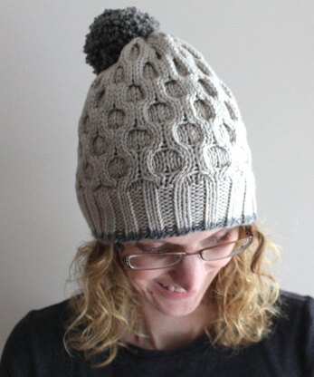 This hat is great on its own or as a complement to the Fashion Forward Cowl. It’s relaxed, slouchy styling fits with any outfit. The ribbing plus the honeycomb cable pattern are warm on a cold winter day. It is worked in the round from the bottom up and the minimal crown decreasing flows organically from the honeycomb body. This pattern requires one skein of Cascade Yarns 220 Superwash Aran plus enough yarn to work the contrast colour stripe and to make the pom pom (which is exactly what was left over from your Fashion Forward Cowl!). Pattern includes notes, list of abbreviations, and the stitch pattern is both written and charted. The increase used is the Left Lifted Increase (LLI) which doesn’t leave unsightly holes. A photo tutorial is included in the pattern. Skills required: knitting in the round, cabling with a cable needle. Stitches used: k, p, LLI, C4F, C4B, ssk, k2tog.