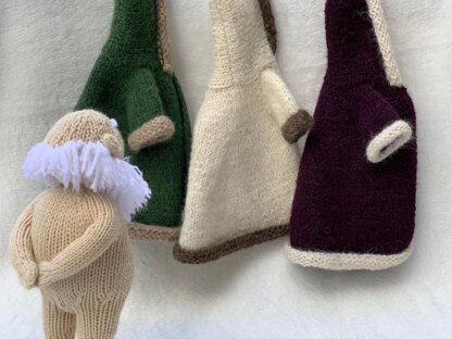This hooded cloak was designed to fit my Forest Gnome pattern. However, it has a wrap-around front so it can be worn by dolls of varying sizes by simply adjusting the length of the garment and sleeves.