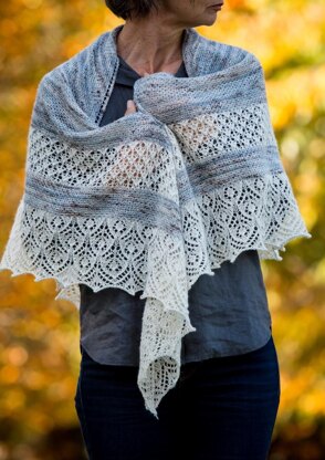 This shawl is a great way to combine lace and beautiful multi-coloured or speckled yarns. Often a pretty multi-coloured yarn competes with the lace motif, but there is no chance of that happening when the lace is worked in a solid colour and the multi-coloured yarn is knit in a delightfully simple linen stitch. The linen stitch breaks up lines of colour admirably, while creating a beautiful textured background for the lace. If you’re anything like me, you can’t resist those speckled beauties from you favourite Indy yarn dyer, well now there’s a way to use them!