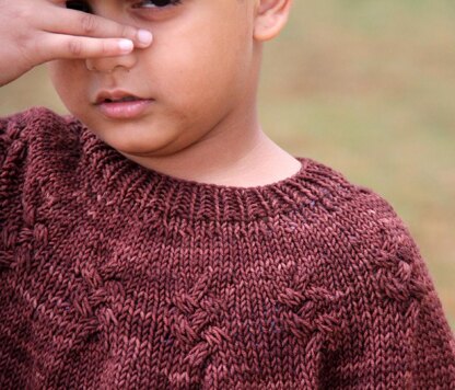 Circular yoke sweaters look charming on kids and is fun to knit. The simple math of increasing to create a growing circle is fascinating to me. I added my love for asymmetry to this and thus Felber was born. The name means bent, twisted to indicate the suppleness and I find it apt for the cables used in this sweater.