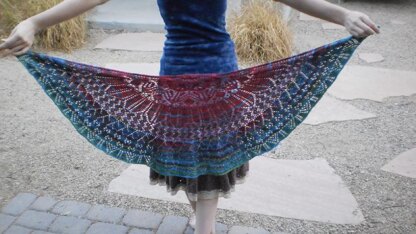This half-circle pi shawl is based on characters of the Fellowship of the Ring, featured in the novel The Lord of the Rings, by J.R.R. Tolkien. Each of the nine members of the Fellowship are represented in this shawl by a distinct lace chart.