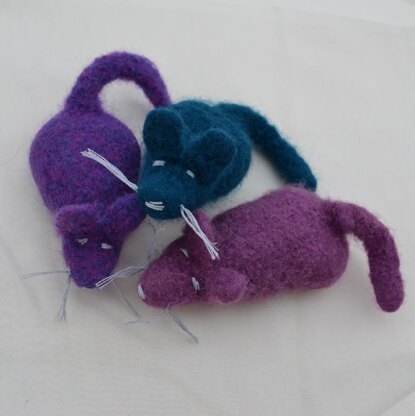 We have a new, pretty rambunctious kitten in the house and so he needed some new toys. I created this new felted cat toy design to help keep him busy. It is now his favorite toy and he even takes it with him for his daily naps! The finished mouse body is about 4 inches long, including the tail it is almost 6 inches. The body is worked in garter stitch, tail and ears are created using I-cord. The mice are extra cute using multiple colors, so this is a great project for felt-able stash yarns. After felting, the face is embroidered. I find it very interesting that my cats will not disturb drying faceless mice, but once the face is embroidered, they will take them off the tabletop. You can rub the mice with catnip for added interest. I stuff them with wool, not polyester batting, so the mice are strong yet lightweight. I keep my cut wool yarn ends for just such a use; you could use roving or additional knitting yarn also. Gauge is not important, as these are felted.