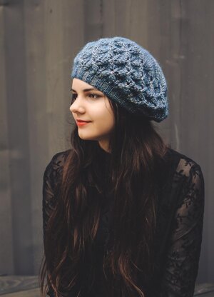 Elegant beret with delicate leaf lace creating botanical texture. Optional inner lining for reversible wear and extra warmth. Seamless construction in worsted weight.