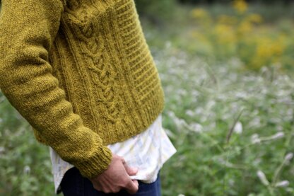 I keep coming back to this flattering, wearable shape. It's fun to knit, easy to seam, and I love wearing a loose pullover with a shirt tail peeking out beneath the hem. This features texture and cables in a gorgeous wooly tweed. The back is just a little different than the front, but the neckline is worked so you can wear the sweater with either side at front! Reversible ;)