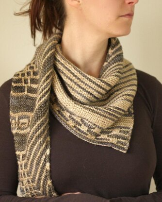 This asymmetric shawl features a mosaic slipped-stitch border and is especially designed for all of us that would rather use up as much of the yummy yarn on hand, this shawl does not have a main and a contrast color, but rather 2 equals. Only one color is used per row, the intricate looking border pattern is all done in a slip stitch/mosaic technique, no stranding yarn or working with 2 colors at one time required!