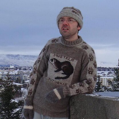 Along the sleeves there are big footprints in a 12 cm broad field of stockinette stitch that continues over the shoulders, the yoke and up to the neck, so that it looks like the ferrets have walked up to cuddle around the neck.