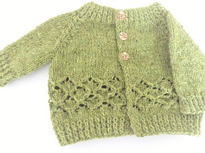 Fianna is a top down raglan design with simple rib detail and a lattice effect lacy lower border. It is knit in one piece and then an optional crochet trim is added to the button bands. In addition to approximately 100 - 300g of DK yarn you will need 3 buttons (1.5 mm in diameter), Fianna works up quickly and would be equally stunning in cotton or wool yarns. Instructions for six sizes are given from 0 - 7yrs.