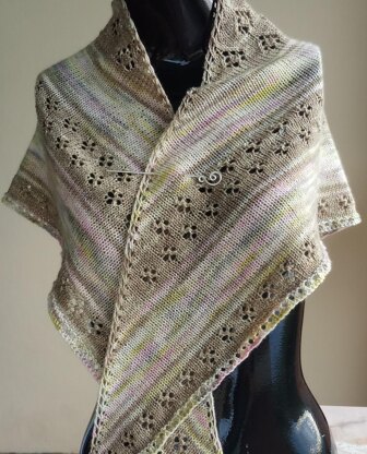 This triangle-shaped shawl incorporates two hand-dyed fingering-weight Eden Cottage Yarns. The background is knit in Stockinette stitch in a variegated colorway and the foreground features eyelet lace flower patterns worked in a semi-solid colorway with sparkles.