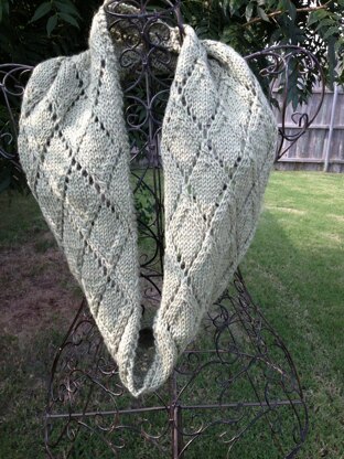 The pink scarf was knit in Sock weight yarn on size US2 (2.75 mm) with a gauge of 28x32 in 4" of Stockinette.
