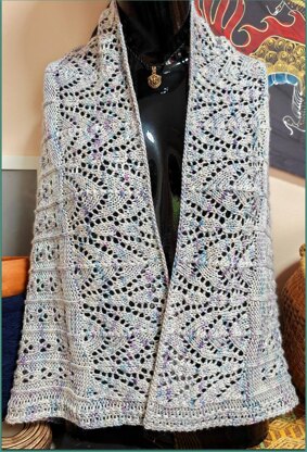 I had a skein of Miss Babs Big Silk in Mariposa and my goal was to design a lace wrap that could be knit in one skein: I think the speckles of purple and blue in this colorway enhance the design – and by the way reminded me of blueberries that I enjoyed throughout the knit!