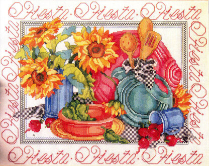By Barbara Baatz Hillman. Classic Fiesta, America’s favorite dinnerware introduced in 1936 is still a collector favorite. It is still being produced today and the art deco style china pattern is depicted in this vibrant and charming picture with the addition of sunflowers, peppers and checkered linen. This design will look great in the kitchen and has a south of the border feel. It’s Fiesta time!