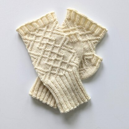 Knit with sock/fingering weight yarn, these finely knit fingerless gloves feature a ribbed cuff and fingers with an argyle texture pattern created with simple cable stitches.