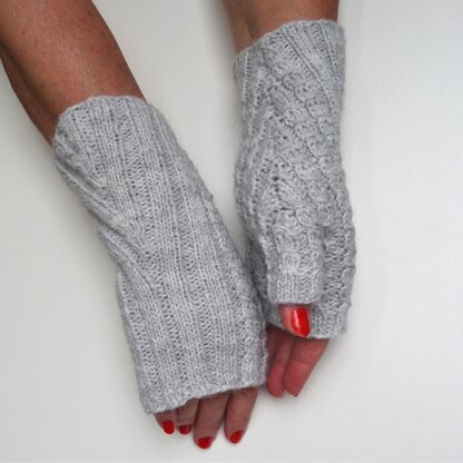 What do you do with your hands while walking outdoors on a chilly day? Keep them in your pockets, pull your sleeves over them, or wear mittens? If you are like me, checking your cell every now and then, fingerless mitts are be the way to go. These mitts are worked in rib and mock cables. A gusset makes them fit perfectly and feel comfy. The pattern comes in three widths. Ribbing’s stretchy quality make it fit most hands. Length is adjustable.