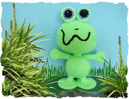 Zany little frog like monster, he stands 8 inches high and is knitted flat using 3mm needles and DK or equivalent yarn throughout. A toy to bring a smile Fun easy pattern with no complicated stitched or shaping.