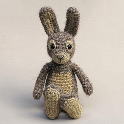 Materials For this rabbit you’ll need worsted weight yarn and an E US/3.5 mm crochet hook. You’ll need two colours, murky brown (3/4 of a 100 yard skein) and camel (1/4). These quantities are estimates. For the eyes I’ve used 8 mm animal eyes. You will also need fibrefill and pellets for a bit of extra weight in the body (I use Hama beads) and a very dark brown embroidery yarn. Lopi colour numbers: 1400 and 1420.