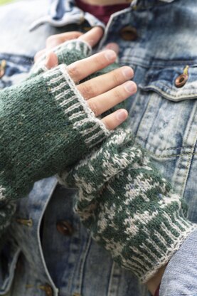 These fingerless Fairisle mittens have a long cuff. Knitted in Rowan Felted Tweed DK, they come in the same colourways as the Fir Trees Hat pattern with the same motifs.