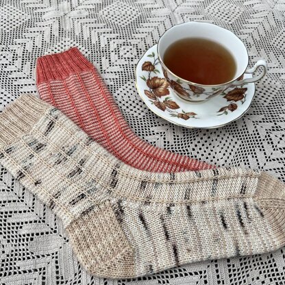 These socks are knit in a purl stripe pattern overlaid with slipped stitches, and if you dislike purling, they can be knit inside out! They are an unusual way to use a Mandi’s Makings Share A Pair sock set or two 50 gram skeins, or you could use self-striping yarn with a solid or tonal. The pattern is easy to memorize once it’s established.