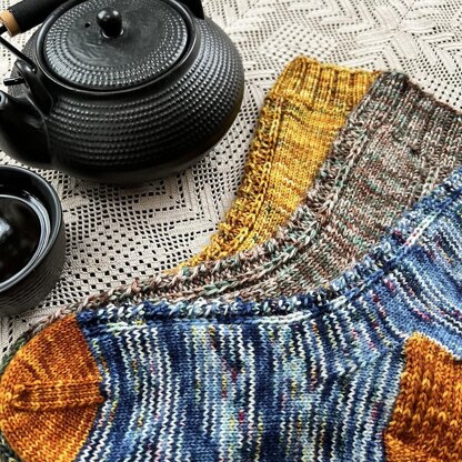 These socks have a pretty faux cable and eyelet band on the front and back that works well with variegated or tonal yarns. The pattern is a four row repeat that is easy to memorize once it is established. There is a single stranded version, and a DK/double stranded option included.