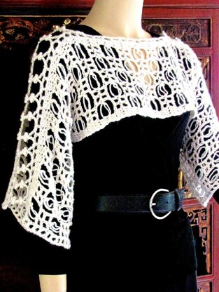 My goal with Fish Lips is to bring out a bold, modern side of Love Knot stitches (a.k.a. Lover's Knots, Solomon's Knots). I started with a scarf, then also liked it worn sideways like a pullover shrug; so I joined two shorter scarves with a "rosebud bridge" seam. The wide seam also softens the bateau neckline for a comfortable fit.