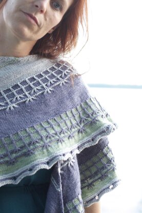 Fissure is about change. Letting change happen and making change happen. Change that takes place in nature and in our lives everyday. In nature change often is seasonal and cyclical and ever repeating in a never ending dance. Fissure can be the dry earth cracking open in the hot summer sun, or concrete giving way to roots pushing up from below the sidewalk. Fissure uses 3 colors in subtle contrasts, a slipstitch and slip stitch cable pattern. You can easily manipulate these stitches without ever using a cable needle. I didn’t use one for the entire shawl even though the pattern calls for one.