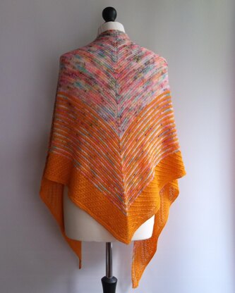 This garter stitch triangular shawl mixes sprinkles with a solid color. Starting with the sprinkles yarn, then striping with the solid color before working a twisted stitch border. Stitches/Techniques used Yarn over, make one left and right increases. Twisted stitches Garter tab cast on