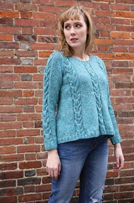 This is a pattern for a flared cable jumper, originally published in Knitting magazine. It is in stocking sticth with cable panels, rib edges, raglan sleeves and is slightly flared at the sides. Photos Laurel Guilfoyle.