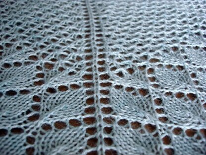 Fledgling is a top-down triangular shawl designed to showcase a skein of special sock yarn. The three main patterned sections are related feathery motifs that use a number of knit stitches between the yarn overs and their accompanying decreases to shape the fabric into peaks and valleys, including the wide shallow scallops that edge the piece. Only right-side rows are patterned -- every wrong-side row is purled. Choose a drapey yarn in a solid or subtly variegated semi-solid color for best results.