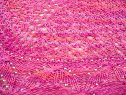 This a bottom-up triangular shawl, worked in two sections. It has a lace section border with beads (optional) and a lace body with spine.