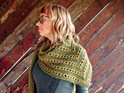 The shawl uses one skein each of two colors of Fancy Tiger Crafts Heirloom Romney. Sample is shown in colors Nettles and Fava Bean.
