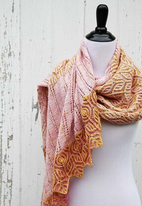 Floret is a botanically inspired trapezoid shaped shawl/wrap that starts with a brioche leaf motif that transitions to a simple lace pattern and ends with a dramatic brioche flower edging.