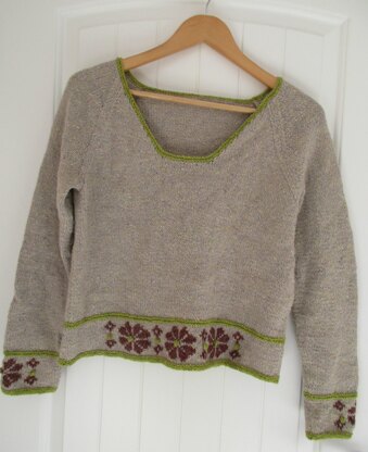 This is a pattern for Flower Border Top, originally published in Knitting magazine. It is in stocking stitch with raglan sleeves, and fairisle border. The neck is slightly squared with a contrast finish. The yarn has now been discontinued, any dk yarn knitting to the same tension can be used.