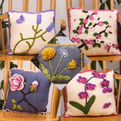 Get all 5 of my flower cushion patterns in one file: Rose, orchid, lavender, apple blossom and dandelion. All cushions are 40cm square and have matching shell edgings. The base for each cushion is the same, with appliqués for each of the different flowers. Save £6 on purchasing all the patterns individually!