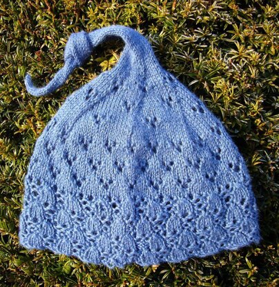 Simple to knit, head hugging and decidedly cute, this stretchy little cap formed of floral inspired lace and finished with a liripipe tied in a simple overhand knot looks great on a wide range of ages and face shapes.