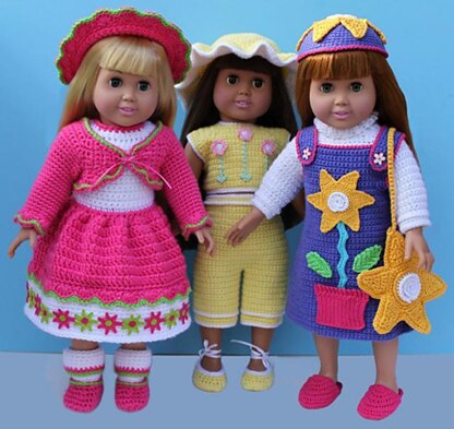 Three complete crochet outfits for your American Girl or similarly sized 18" dolls including dress/jacket, shoes/socks, hat; capris and top with shoes and hat; jumper/blouse, hat and clogs.