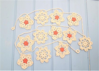 It is made from three different flower motifs joined together on a chain, with a hanging loop at either end. It can also be customised to fit your needs. Want it longer? Crochet more flowers! Only want two types of flower? Just use two! These flower designs can also be used in other projects as well, such as a cushion applique.