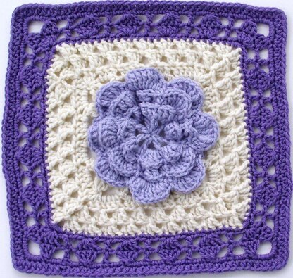 This 12” X 12” square has a large dimensional center flower with a background of an unusual stitch, by crochet innovator Bill Elmore, and a lovely cluster border. Pattern is Intermediate. Special Stitches include the Double Crochet Cluster, Triple Crochet Cluster, dc4tog, and dc3tog.