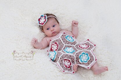 This sweet little coverlet is made using a simple, granny-flower hexagon. It has a final diameter of 32.5 cm (13).