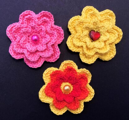 This flower crochet pattern is for making pretty and colourful flowers which can be used as appliques to many things: hair accessories, brooches, cards, boxes, hats, bags etc.