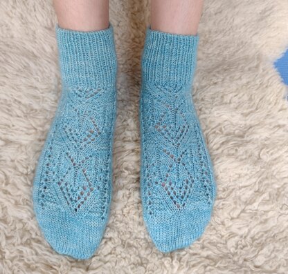 An eye-catching lace panel runs along the top of the foot. Construction is toe-up in the round with seamless cast on, wedge toe and increases either side for the gusset. A short row heel turn is followed by an eye-of-partridge heel flap, and a short section of 1x1 ribbing, to finish the top of the sock.