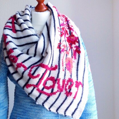 A triangle scarf with knitted hand lettering "FlowerLover", a flowery ornament in red, pink and salmon, combined in a navy style inspired blue and white look.