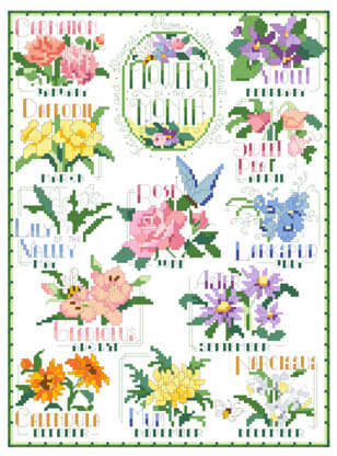 Designed by: Jorja Hernandez. One of Kooler Design Studios most perennial designs, Flowers of the Month looks great as a sampler or as separate small motifs to celebrate a year in flowers. Designer Nancy Rossi captured each flower so well and beautifully.\n
