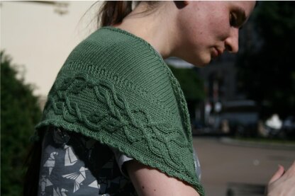 Cuddling up in this shawl with the cables flowing on the edge. The outer edge has a cable that ends in the lofty nothing. The larger cables flow on a bed of purl stitches. The whole shawl is curved with the cables making up the lower part, which is worked first, and a stockinette stitch body as the upper part.
