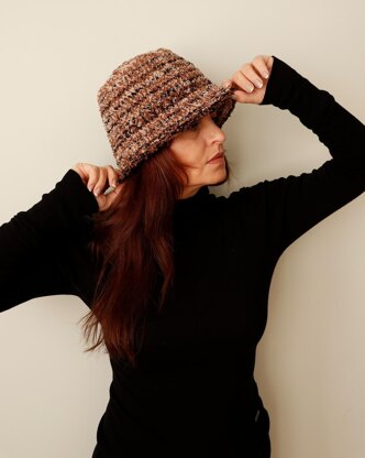 The Fluffy Bucket Hat is worked in two different strands of yarns held together from the top down in the round. The furry yarn is for fluffy vision, the other one for a tightness. For stability of the hat’s construction, it is knitted with a smaller needle size than recommended for the yarn category.