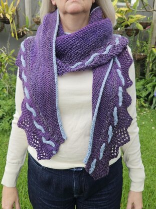 Fuild Movement is a garter stitch crescent shawl that features a Shetland style lace edge and a two-colour cable. The edge is worked first and then stitches picked up and after a couple of rows including a little slip stitch the shawl is worked in short rows until the eye-cord bind-off. Three length options are given.