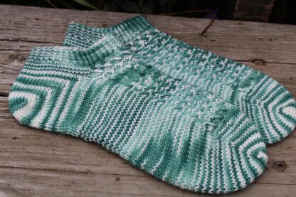 Fluxion socks have an attractive cable pattern on the instep designed to be engaging yet simple enough to use with all of those lovely, uniquely dyed skeins of yarn. They are knit toe up with my favorite shadow wrap short row heel.