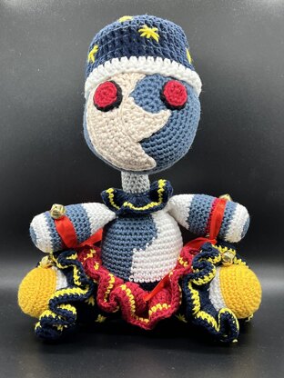 Materials: • Hobbii Rainbow 8/8 Cotton in #29 Jeans Blue (150g); #30 Navy Blue (100g); #1 White (100g); #86 Christmas Red (100g), #54 Bright Yellow (50g), #90 Egg Yolk (50g), #3 Nude (50 g), #16 Light Gray (50g), #9 Black (50g) • 4.5 mm (G+) crochet hook • Stitch Marker • Polyester stuffing • Tapestry needle • Optional: Buttons, bells, ribbons, and wire