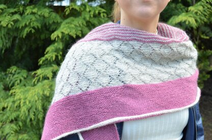 This shawl was designed spontaneously without planning the whole design out first. Each section is a result of a spur of the moment decision that still results in a balanced design. Featuring stripes, a lace pattern and an i-cord bind off, this is an interesting and diverse pattern. Worked without short rows, the shape of the shawl is achieved by increasing two stitches every row.