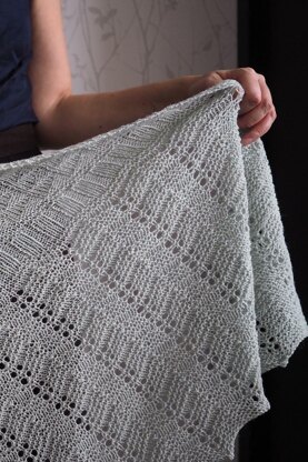 Fold Lines plays with gentle geometric shapes. This asymmetric triangle shawl has triangles and columns and wavy lace, mostly created by knit and purl stitches. The surface is softly textured and looks good on both the right and wrong side of the fabric.