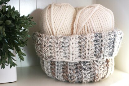 This faux knit crochet pattern is beginner friendly and versatile. With two different sizes, fill your entire house with these. Fold the top down to make a decorative brim or leave it up for a tall, spacious basket. Note that these baskets do need things in them, like yarn or a plant, to stay upright.