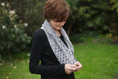 The cowl is knit flat and then grafted. Skills needed include provisional cast on, simple lace knitting, and working Kitchener stitch over both stockinette and garter stitch. Choose between fully written instructions or a combination of charted + written instructions
